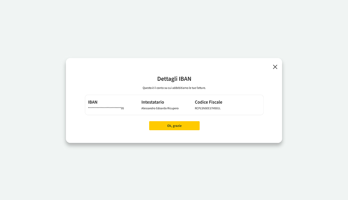 Cliccando sul pulsante “Modifica”, si aprirà una finestra (modale) che descrive nel dettaglio la modalità di pagamento. Di seguito, il contenuto visualizzato, clicca su “Ok, grazie” per procedere nella prossima schermata.