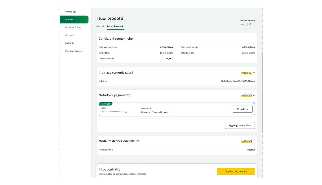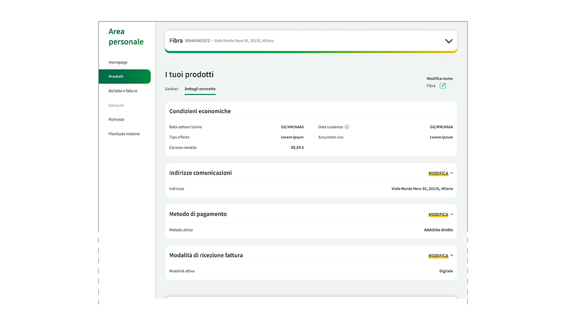 La fattura è organizzata in sezioni per garantire trasparenza e semplicità di lettura nel rispetto della normativa applicabile: riepilogo anagrafica, riepilogo offerta, costi, comunicazioni operative e marketing, ecc.