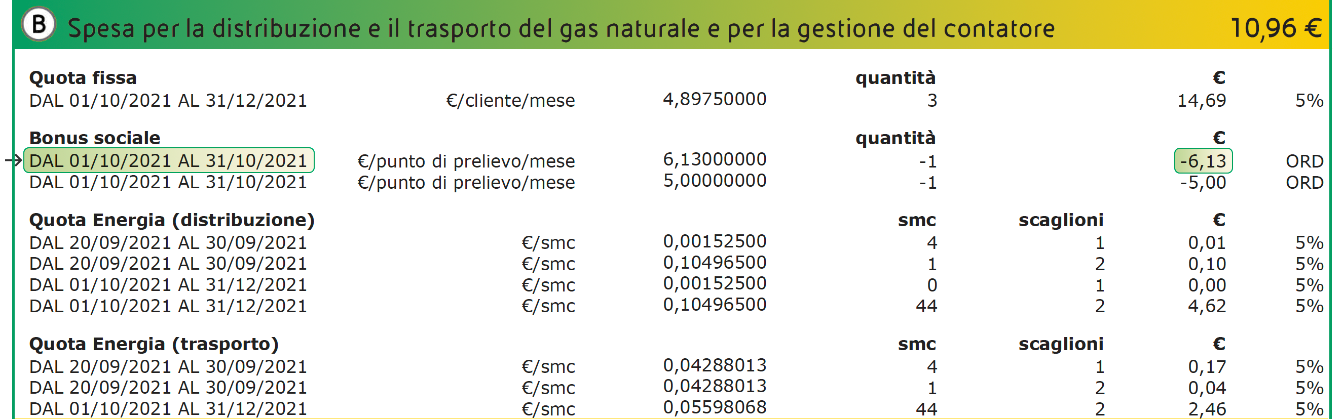 All’interno del box 'Elementi di Dettaglio Gas' nella sezione B - 'Spesa per la distribuzione e il trasporto del gas naturale e per la gestione del contatore', è visibile l’inserimento della nuova rata integrativa mensile di Bonus Sociale da € 6,13 (per disagio economico), importo che potrebbe variare in base alla tipologia di Bonus Sociale già in essere sul cliente.