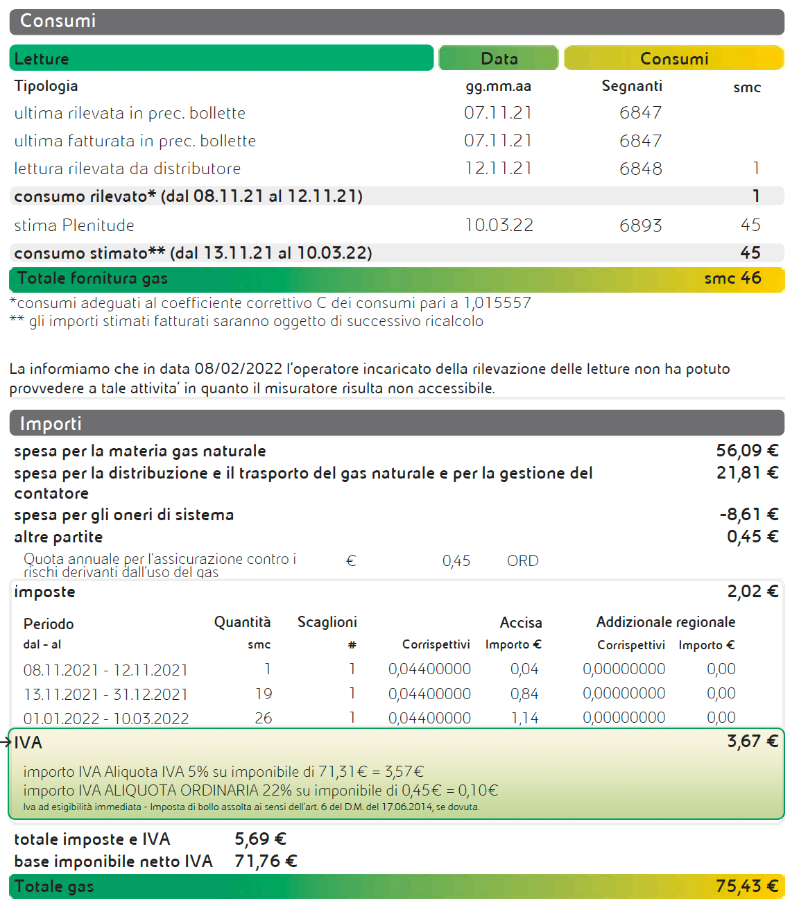Per la bolletta gas, è prevista l’applicazione dell’IVA al 5% sui consumi e sulle quote fisse riferite al periodo di competenza 01/10/2021 - 30/06/2022.