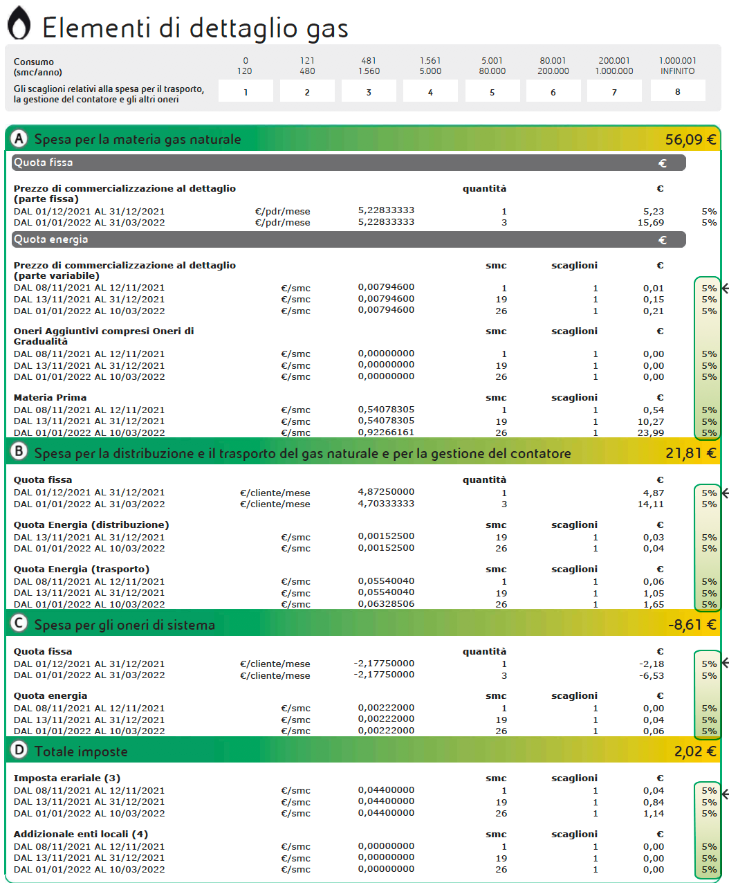 All’interno del box 'Elementi di Dettaglio GAS' è visibile l’esposizione della dicitura '5%' per i dettagli con competenza 01/10/2021 - 30/06/2022 nella sezione A, B, C e D.
